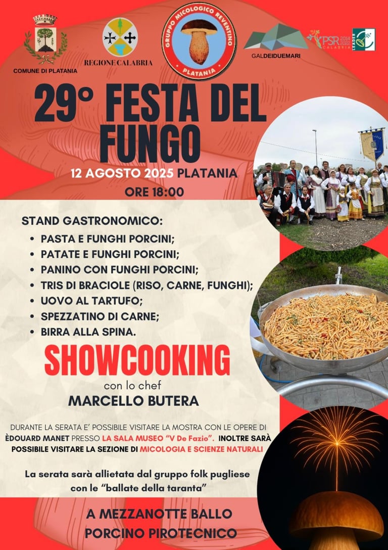Il 12 agosto 2025, la cittadina di Platania ospiterà la 29ª edizione della Festa del Fungo, una manifestazione attesa da tutti gli amanti della gastronomia e della cultura. A partire dalle ore 18:00, i visitatori avranno l'opportunità di gustare specialità culinarie preparate con i funghi di stagione, il tutto accompagnato da un'esibizione dal vivo dello chef Marcello Butera, noto per la sua maestria nella cucina tradizionale.