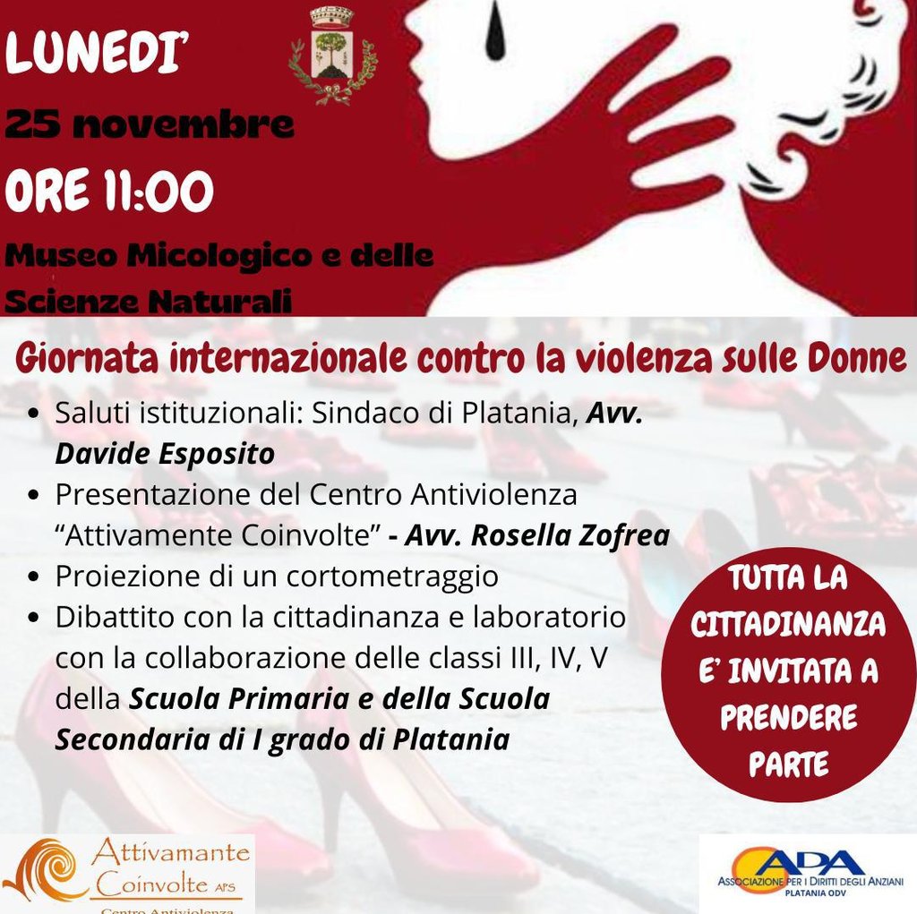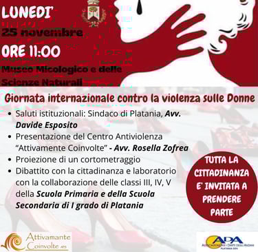 L'Associazione per i Diritti degli Anziani (ADA) di Platania invita tutta la cittadinanza a prendere parte a un'importante iniziativa che si svolgerà in occasione della Giornata Internazionale contro la Violenza sulle Donne. Questo evento, essenziale per sensibilizzare l'opinione pubblica sul tema della violenza di genere, si terrà lunedì 25 novembre, alle ore 11:00, presso il Museo Micologico e delle Scienze Naturali di Platania, 'Valentino De Fazio'.